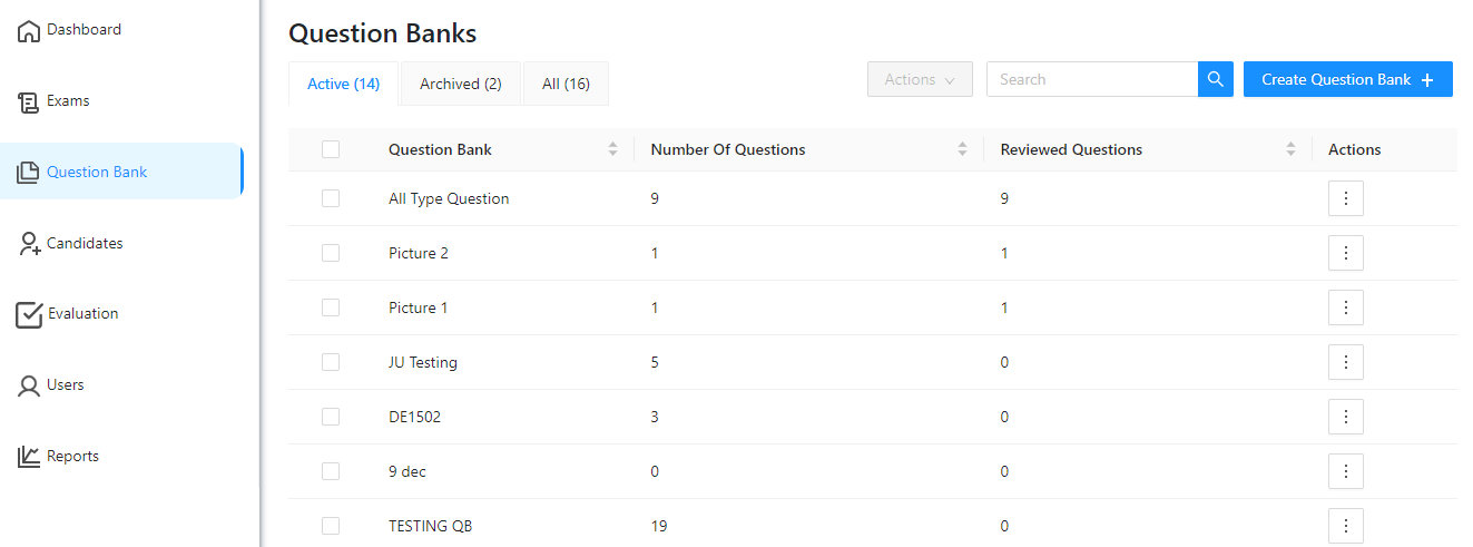 After login in to your examonline admin interface Select the Third option “Question Bank” from the Left side Menu provided and click on “Create Question Bank” tab.