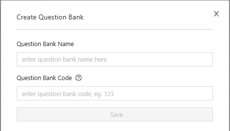When you click on Create Question Bank, a pop-up will appear asking for the question bank name and code (these should be unique). Enter the details accordingly and save the page.