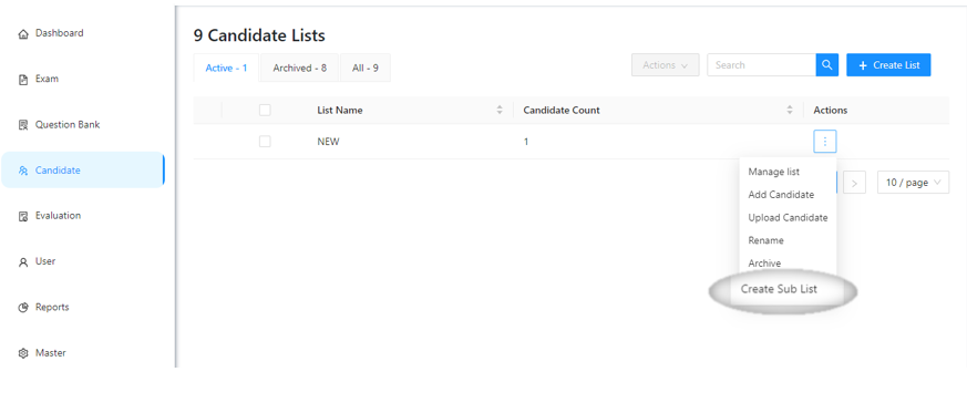 Navigate to the "Candidate" option in the left-side menu and select the "Create List" tab.