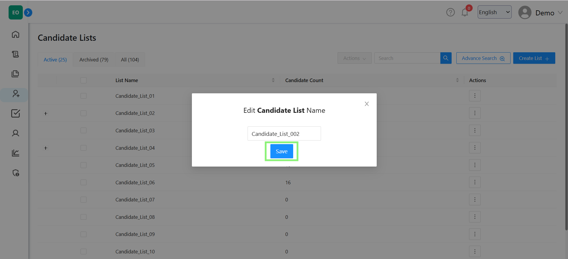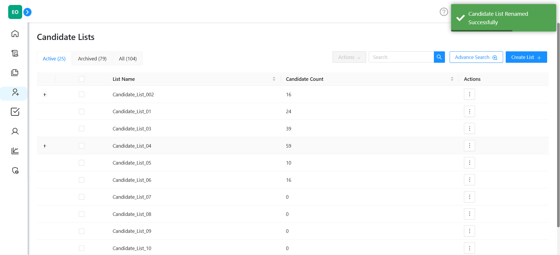 Once saved, the candidate list will be renamed. You will see a confirmation message at the top-right corner of the screen.