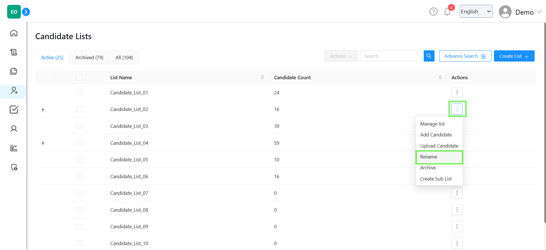 Step - 1 Locate the "Candidate Tab" on the fourth option. Step - 2 Now, select a candidate list and select the sub list which you wish to rename and then click on the "Three dots" below the actions menu, a variety of options will appear. Click on ...
