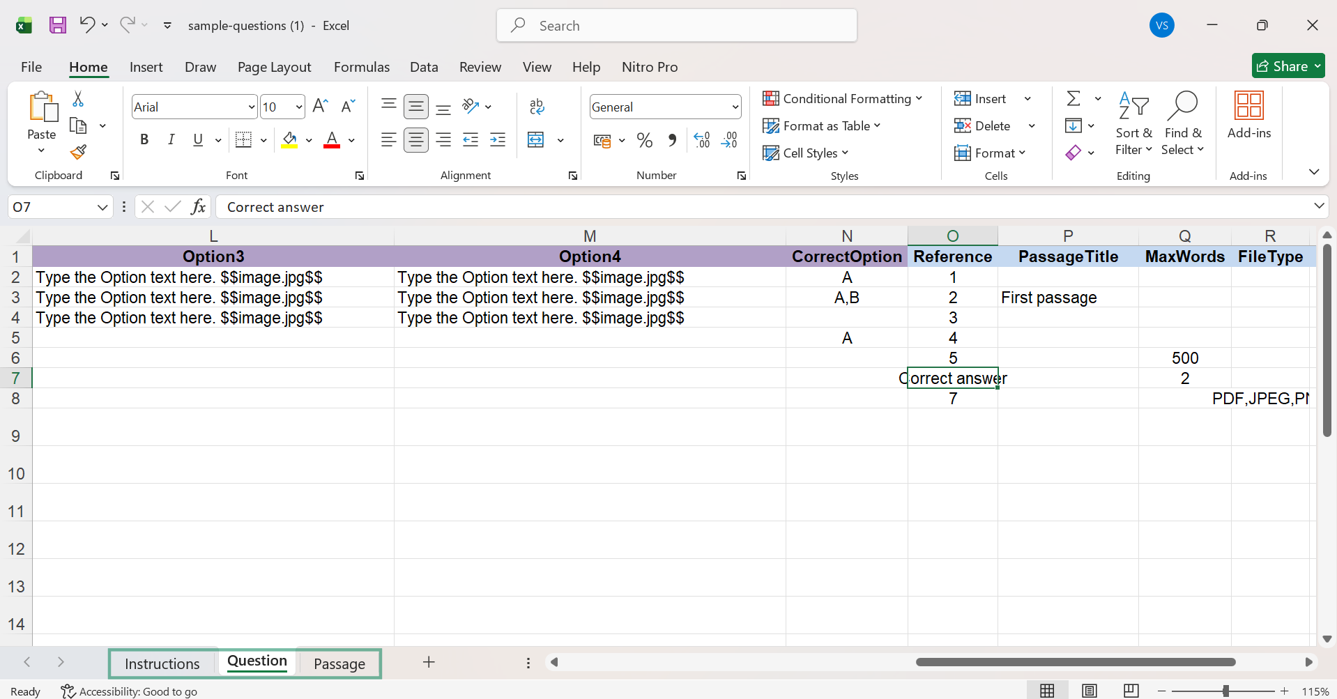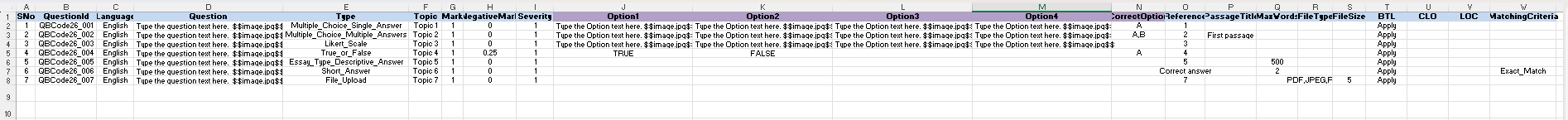 - Columns J, K, L, M (Options): Contain the text of the options for the question. Images can be inserted using '$$' symbol Example: