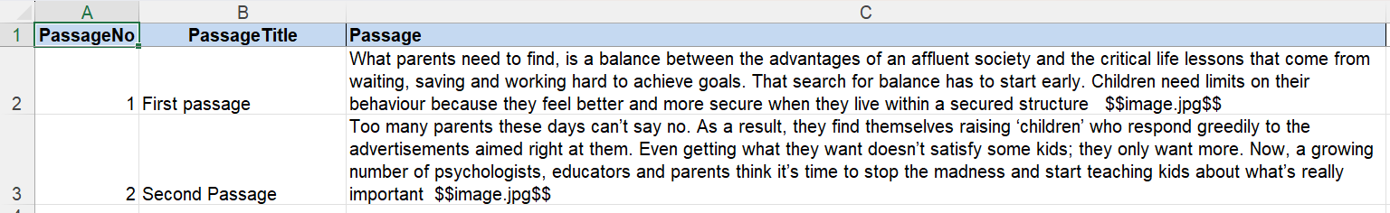 - Column C (Passage): Enter the passage text that will be displayed on the candidate’s screen when the associated question appears. Images can be inserted using '$$' symbol Example: