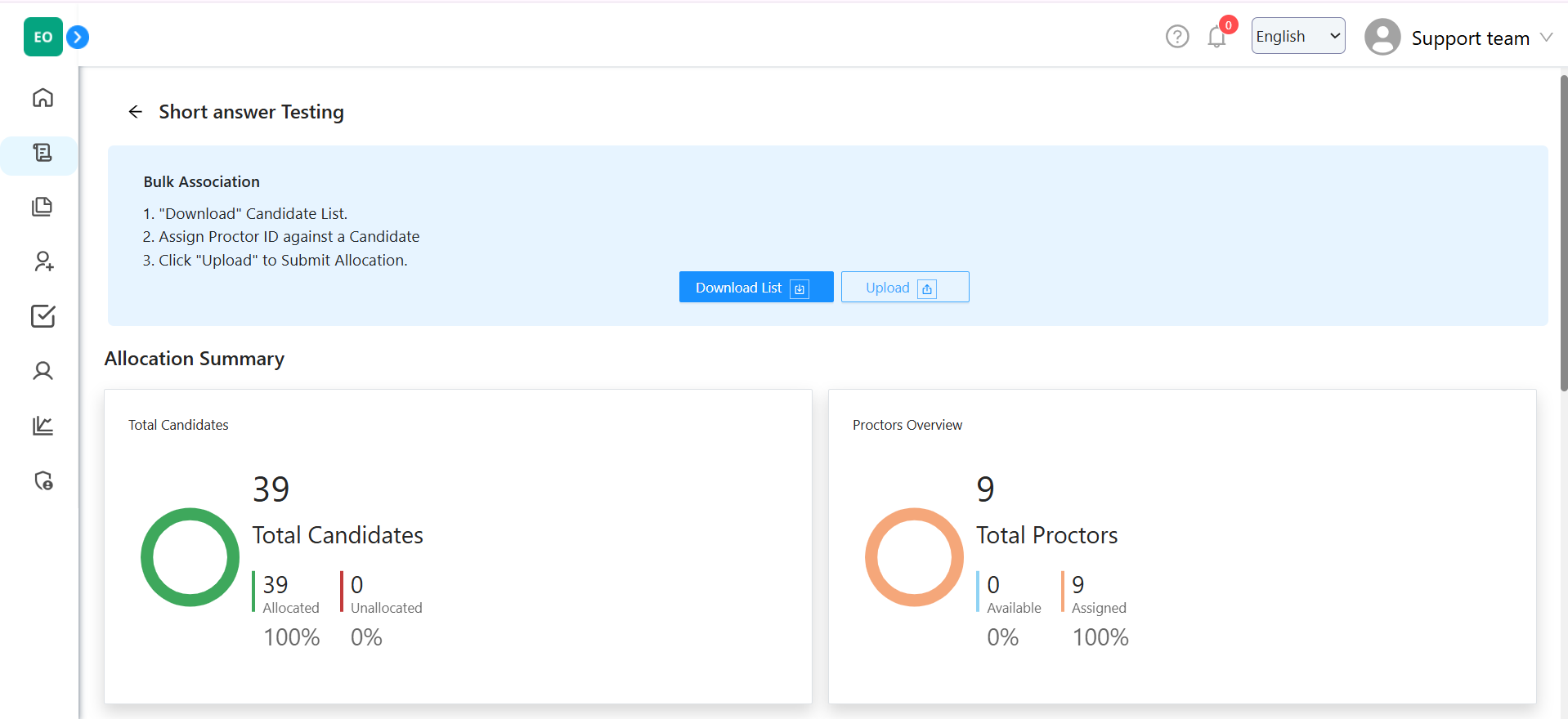 Proctor pre-allocation allows administrators to assign specific proctors to candidates before the exam. This ensures smoother exam execution and enables controlled allocation based on defined criteria such as candidate gender or custom grouping requirements.