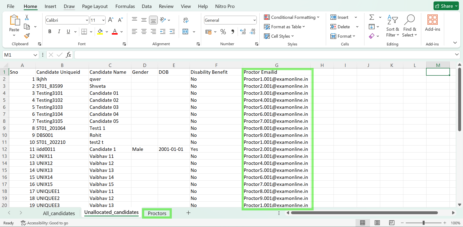 Copy the proctor email IDs from the Proctors sheet and paste them against the respective candidates.