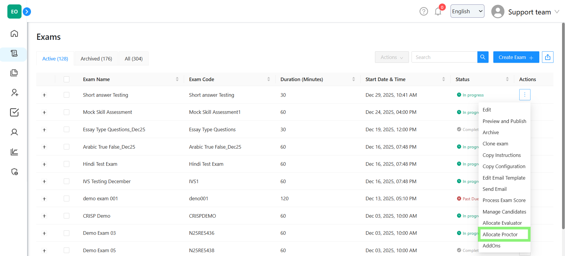 Step 6: Click on the three-dot action button next to the exam and select Allocate Proctor.